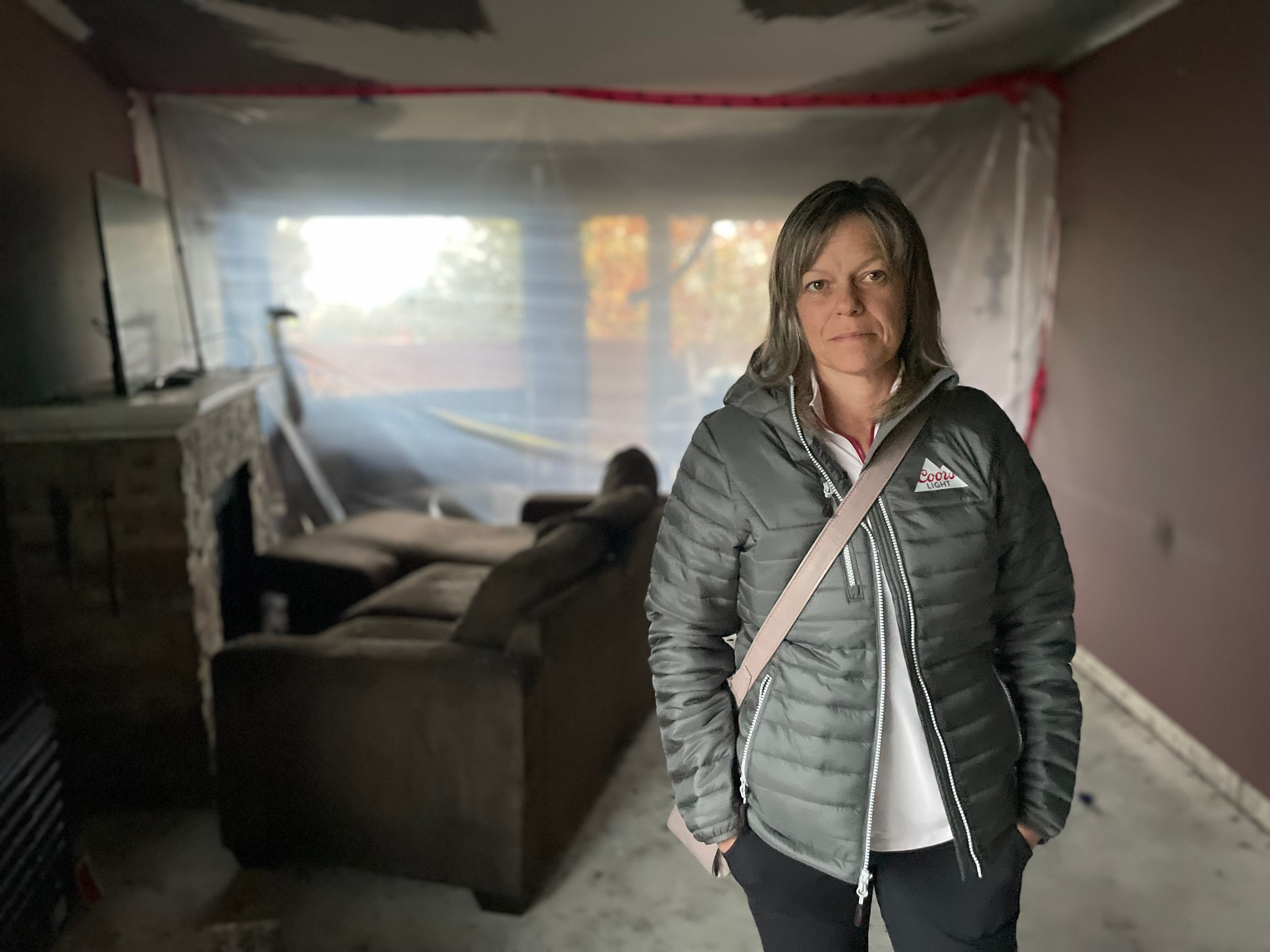 [Tammy, a Nanaimo resident, stands inside apartment, which was set on fire by a local homeless drug users]
