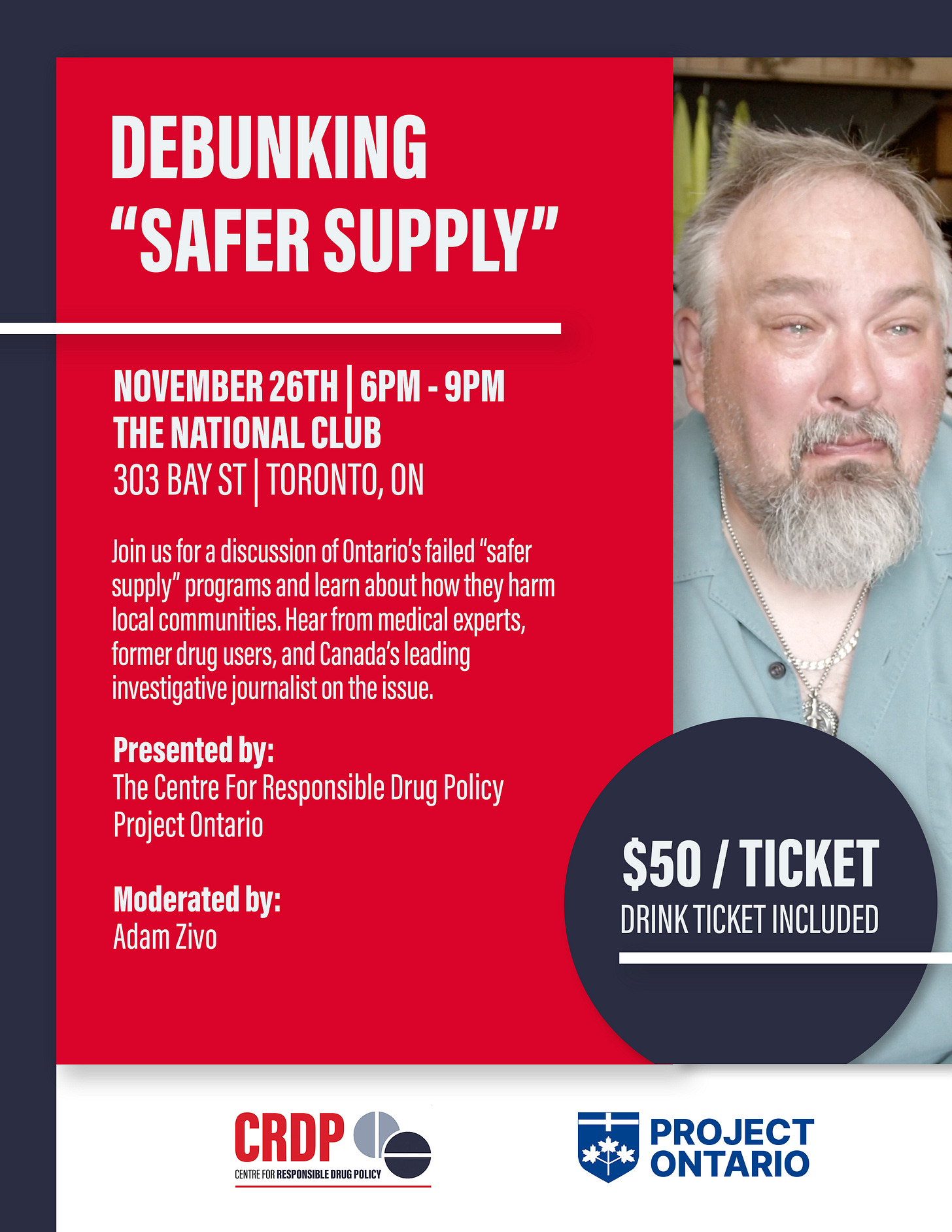 The Centre For Responsible Drug Policy is partnering with Project Ontario for a new event: Debunking “Safer Supply.” The evening will feature a screening of “Government Heroin 2,” a fireside chat between Adam Zivo and Dr. Lori Regenstreif, and an interview with an individual with lived experience on how diverted safer supply opioids worsened their addiction. This will be followed by a Q&A and a post-event social.